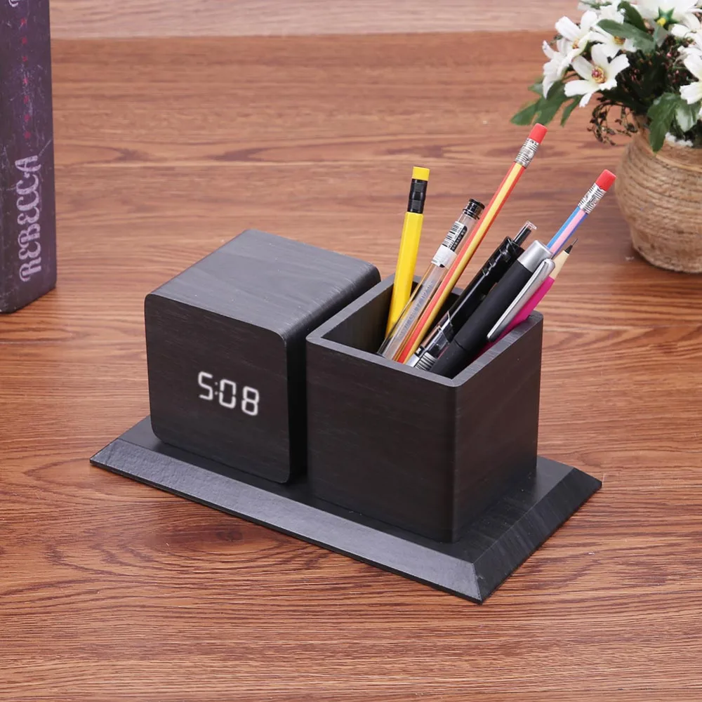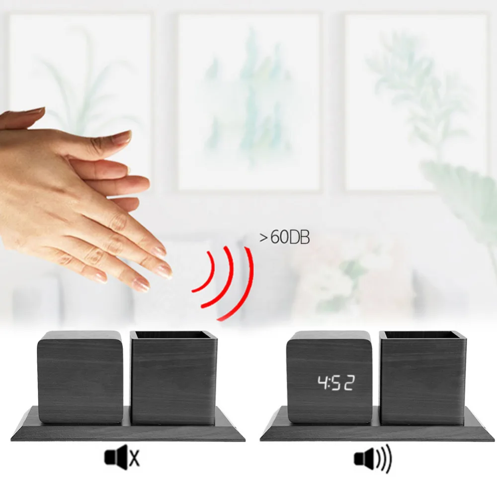 Sound Control Digital Electronic Led Alarm Clock Pencil Pen Holder Time Date Temp Display Desk Orga